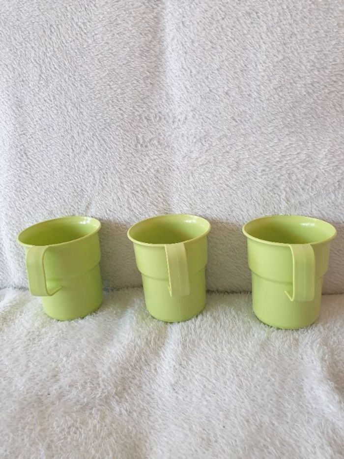 Ensemble de 3 tasses en plastique vertes. Avec anses. Elles mesurent environ 8cm de diamètre et 9.5cm de haut. Très bon état.