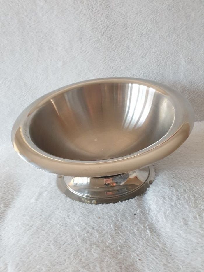 Cul de poule en inox. Le bol mesure environ 29cm de diamètre et 15cm de haut. Le support mesure 19cm de diamètre pour la partie posé et 12 cm pour la partie ou le bol repose. Très bon état jamais utilisé.