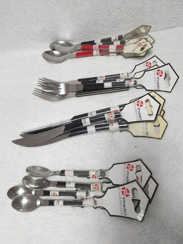 Ensemble de 16 couverts neufs 4 couteaux 4 fourchettes 4 cuillères à café 4 cuillères à soupe (2 noirs et 2 rouges) Manches noirs 1 fourchette a perdue son étiquette Pradel excellence