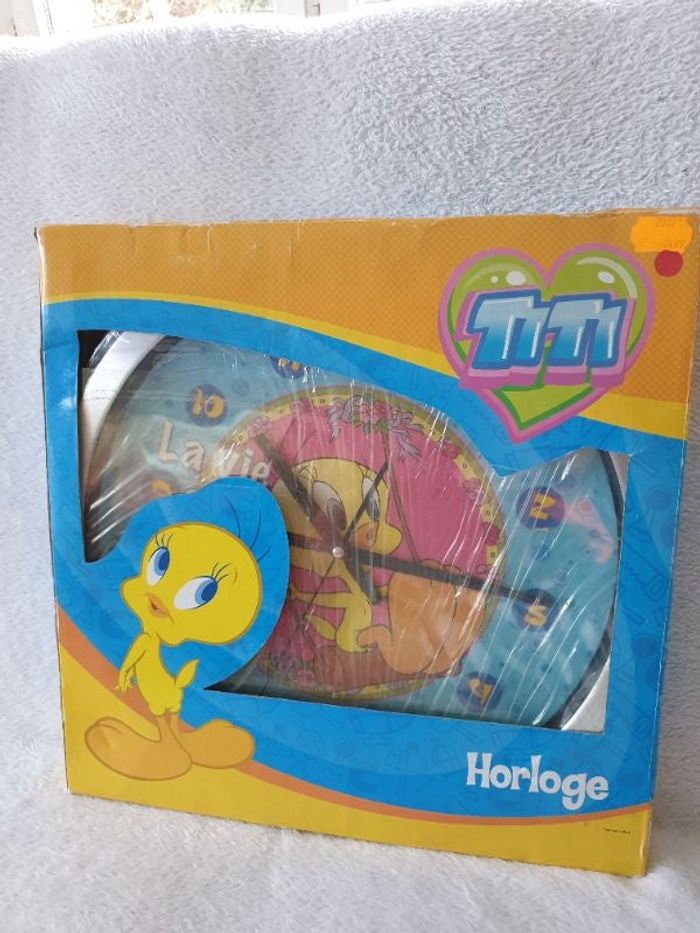 Grande Horloge Looney Tunes Titi. Neuve, juste déballée pour la photo. Titi et Grosminey. Son Diamètre est de 40cm. Le carton est un peu abîmé mais l'horloge est neuve.