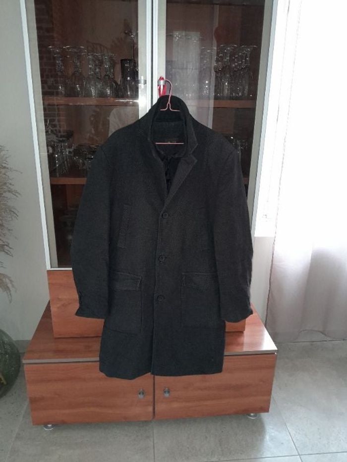 En très bon état. 2 grandes poches sur le devant et 2 poches intérieur. Doublure intérieur qui peut s enlever pour éviter le double col et la fermeture centrale, ainsi le manteau se ferme qu avec les boutons.