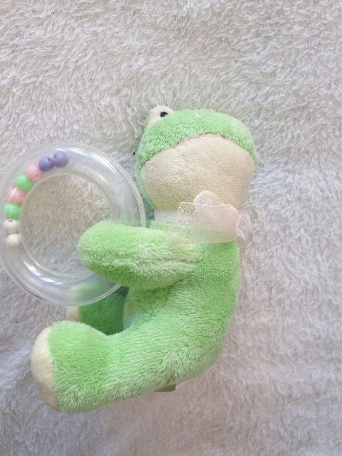 Grenouille peluche verte avec un hochet rond avec des perles. Elle mesure environ 13cm.