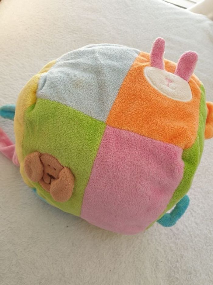 Cube en peluche. Tout mou. Avec un hochet à l'intérieur. Il mesure environ 15cm de côté.