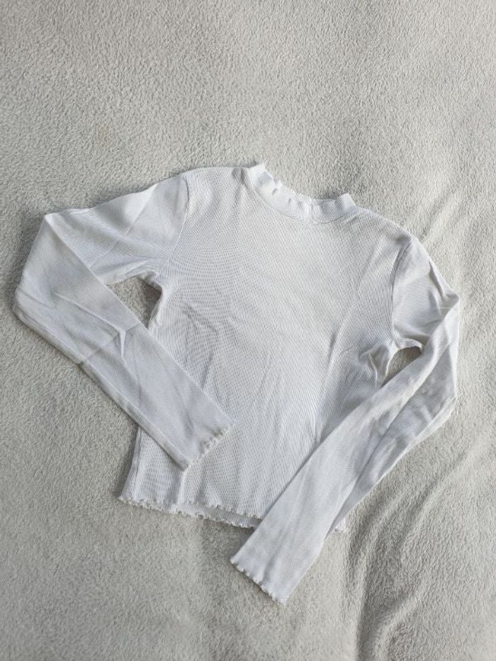 T-shirt S. Tissu a côtes. Blanc. Bas et Bas des manches froncés.