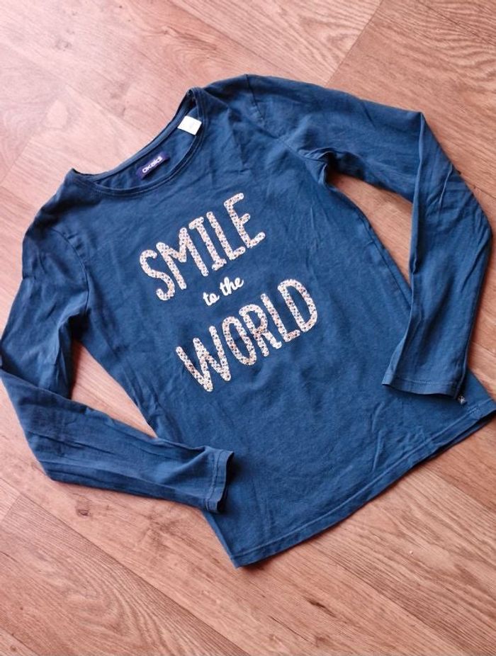 #Mi_laine10ansfille #okaidifille T shirt manches longues de coloris bleu canard. Col rond Motif sur le devant du haut en forme de fleur avec des coloris bleu canard, jaune moutarde et blanc. Vêtements premières mains et réduction automatique dès le 2eme article