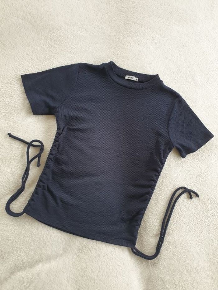 T-shirt S bleu marine. Mailles cotelées. Se ressert sur les côtés. Taille S.