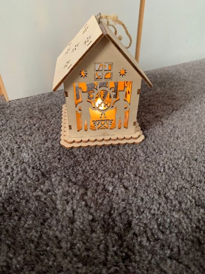 Petite maison avec lumière à l'intérieur ressemblant à une bougie, fonctionne avec pile (fournie), déco peut être suspendu