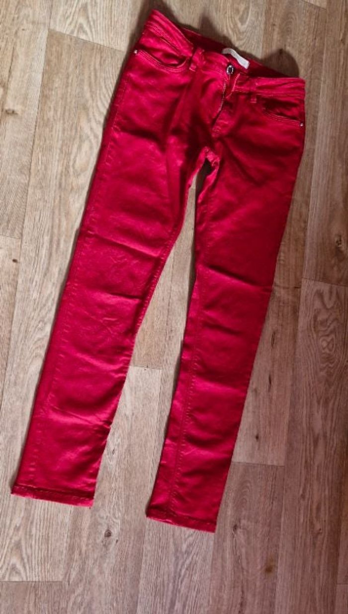 Jean de coloris rouge. Possède 2 poches avant et 2 poches arrières. Fermeture éclaire et bouton. Petite plaque cousu à l arrière du pantalon)voir photo). Zara basic.