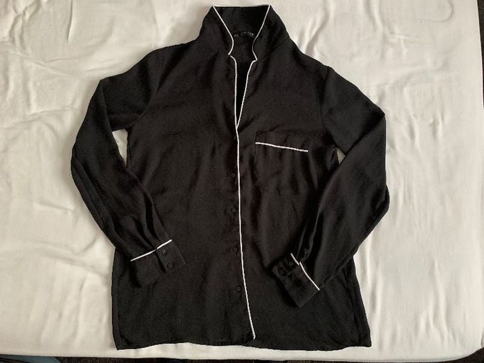 Chemisier noir avec finition blanche, petite poche sur le devant, col en V, taille S de chez Zara