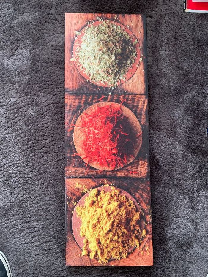 Long cadre de 90cm sur 30cm de large, avec photos d'épices dans les tons orange marron, cadre en bois et toile