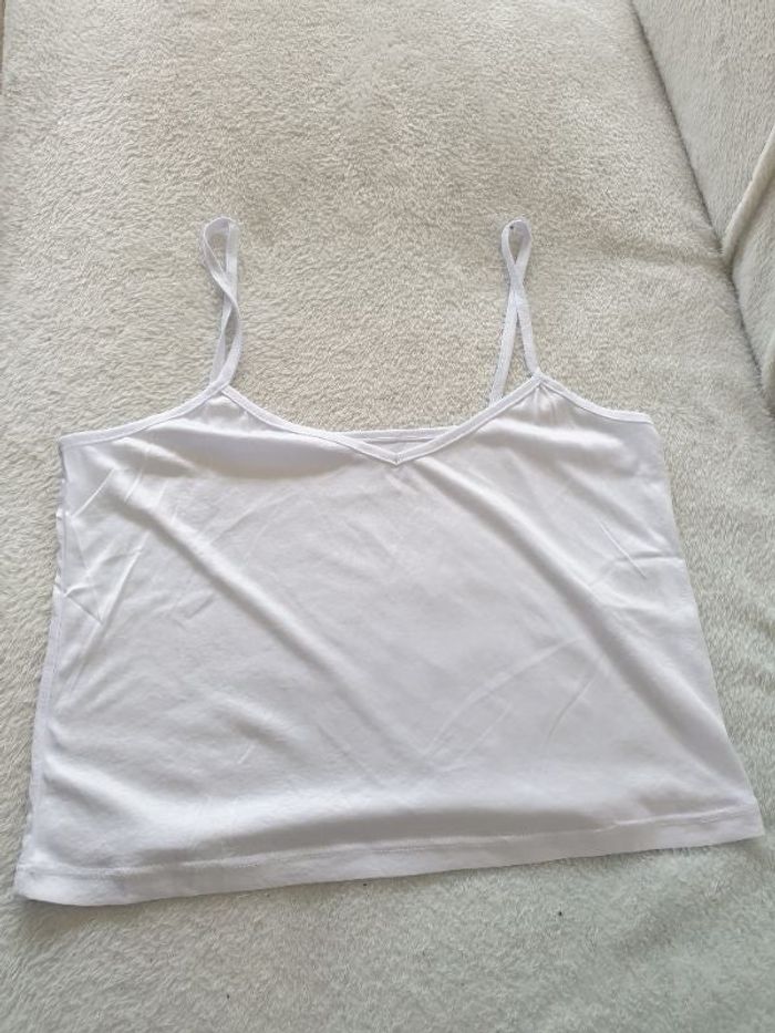 Debardeur court blanc. Taille L . Il mesure 30cm de haut et 40cm de large. Neuf. Jamais porté.