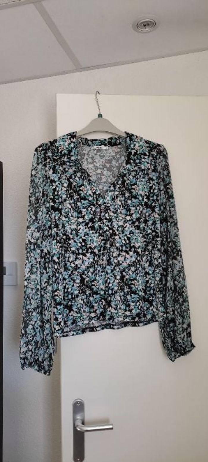 Imprimé bleu, vert et blanc sur fond noir Col V chemise, manches blousantes en voile de polyester avec finition élastique. Taille droite Très bonne tenue. Taille L 40/42