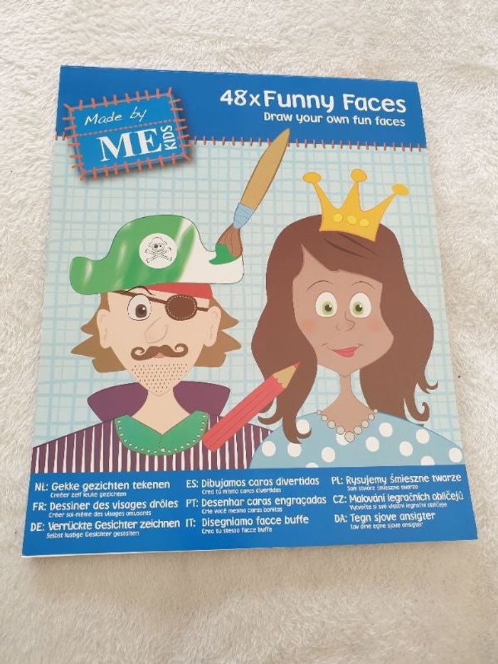 Cahier avec une quarantaine de visage à decorer, colorier, peindre ou... Il en manque une dizaine c'est pour cela qu'il y en a une quarantaine au lieu de 48. Le cahier mesure 27cm x33cm.