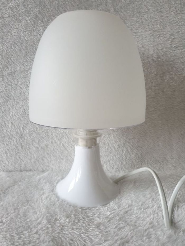 Petite lampe blanche. Elle mesure 26cm de hauteur et 8 cm au plus large. Le câble mesure 150cm avec interrupteur. Fonctionne parfaitement.