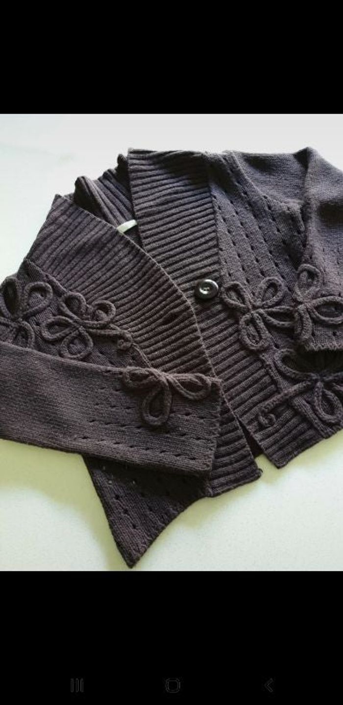 Petit gilet marron avec troues et fleurs sur le devant et aux manches, un bouton devant. 70% acrylique et 30% laine. Étiqueté XL mais taille plutôt L.