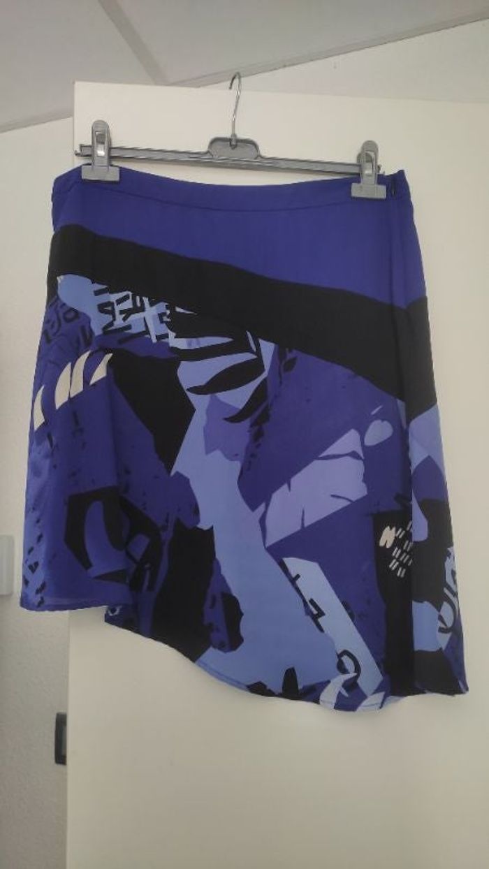 🌀 doublée, en polyester 🪡 Zip sur côté, pan gauche plus long Motifs noirs, bleus ciel et blancs sur fond bleu soutenu