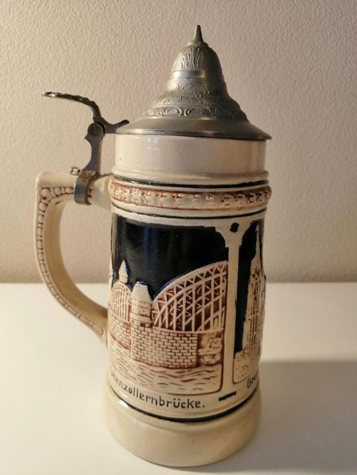 Carafe de germany chope de bière Germany 0,5 L En très bon état CHOPE À BIÈRE GERMANY DBGM N°5 DÉCOR EN RELIEF - Gruss aus Koln - Rathaus - Hohenzollernbrücke Contenance : 0,5 L Couleur : reliefs beige et noir - Couvercle argenté Dimensions : 9 Ø x 22 cm +/- Poids : 709 GRAMMES