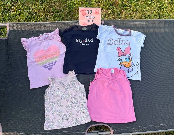 Bonjour, A vendre lot de 5 t-shirt taille 12 mois plusieurs marques : 4€ Ils ont été porté, le T-shirt rose avec le coeur a des taches voir les photos et des bouloches sur certains. Mis sur d’autres groupes de vente Regardez dans mon dressing j’ai des vêtements garçon du 3 mois à 10 ans Et des vêtements fille de la naissance à 3 ans