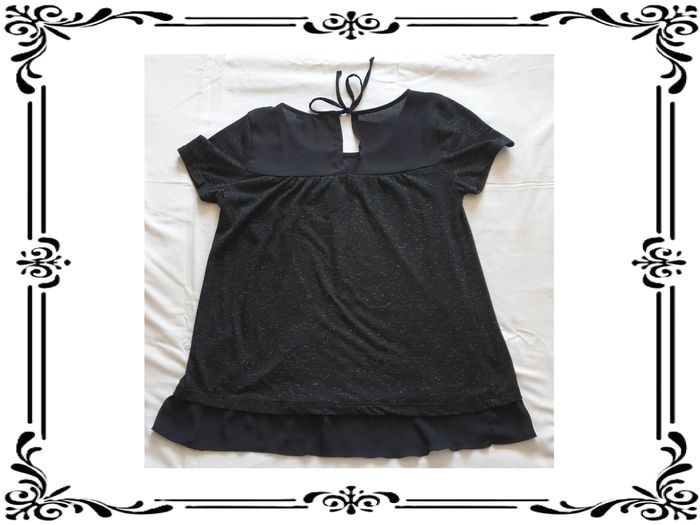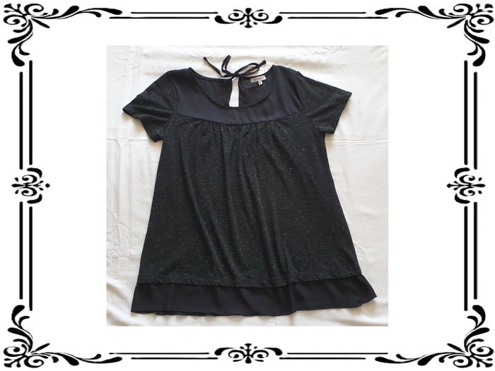Tee shirt taille 36. Tee shirt noir avec fils brillants argenté. Haut du buste et bas en voile noir. Ouverture dans le dos sur 12 cm. 63 % polyester, 34 % viscose, 3 % fibre métallique. Largeur d'épaule à épaule: 35,5 cm Largeur sous les bras : 43 cm Largeur à la taille: 49,5 cm Hauteur du décolleté : 10 cm Longueur totale: 61 cm Longueur des manches: 15,5 cm En très bon état. Lady Blush. 3€. #vero38110vetementsfemme36