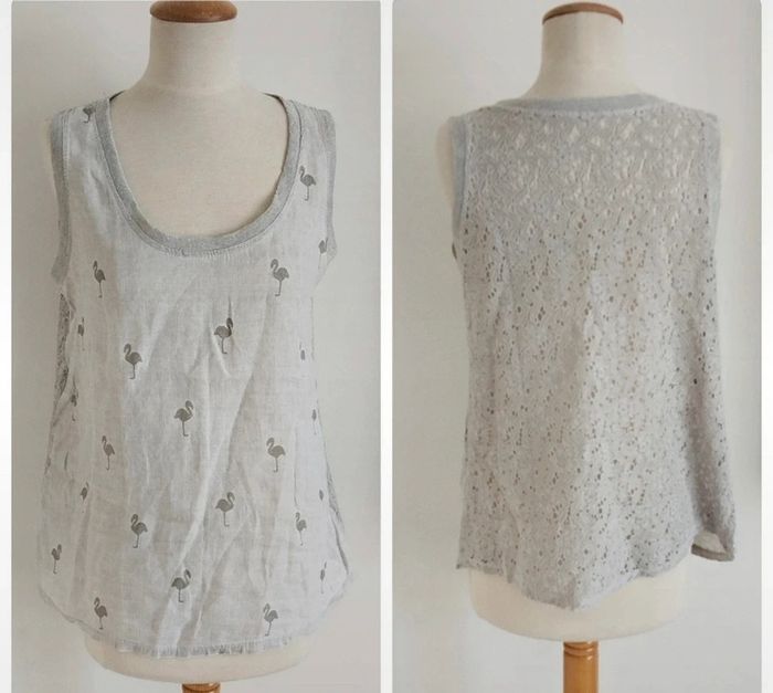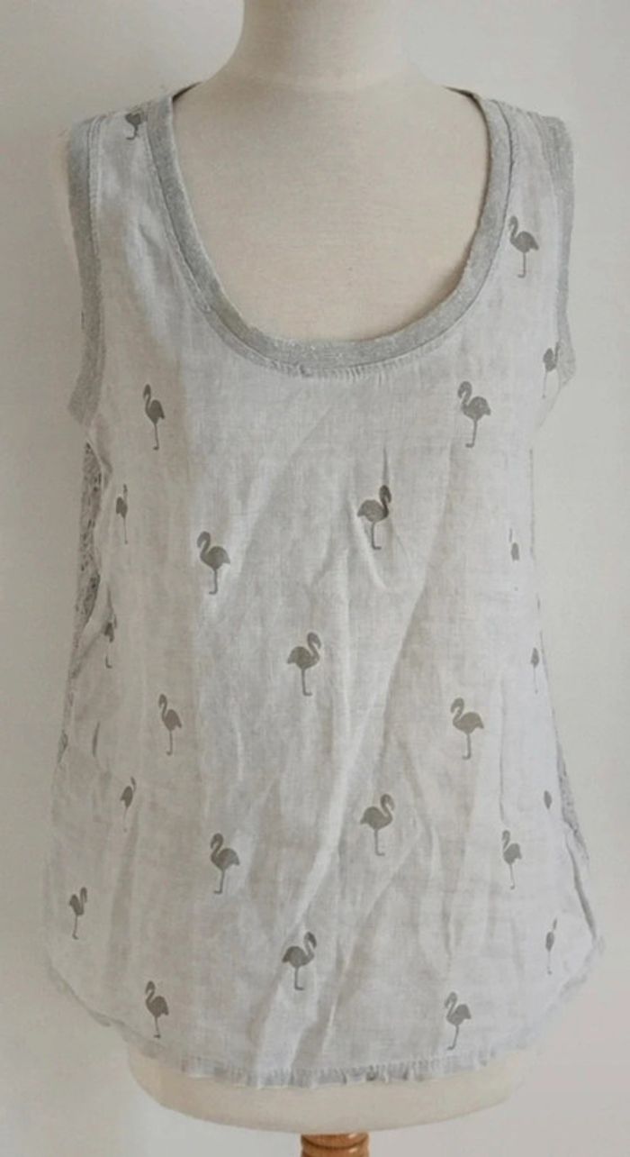 Blouse sans manches grise et argentée thème flamand rose dos dentelle taille 40 - photo numéro 1