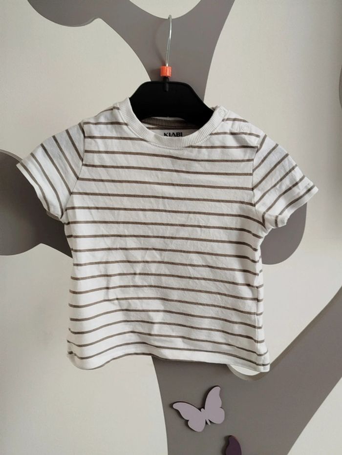 Tee-shirt manches courtes marinière blanc et kaki Kiabi taille 9 mois - photo numéro 1