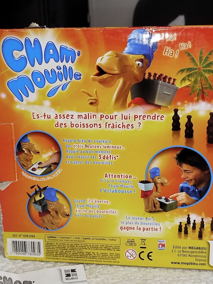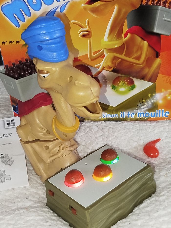 🎄Jeu en très bon état.Année 2015 A noter⚠️ il manque une bouteille mais rien n'empêche de jouer à 🐫 mouille Est tu assez malin pour lui prendre🐫 des boissons fraîches ? Repère bien les couleurs des trois boutons lumineux... appuie au bon moment pour réussir les 3 défis et gagner des bouteilles.🍾🍾 Attention... si tu te trompes le chameau 🐫t'éclabousse ! Quand il s'énerve il éjecte les bouteilles hors du panier. Le joueur qui a le plus de bouteilles gagne la partie ! Piles fournies