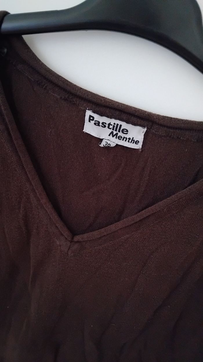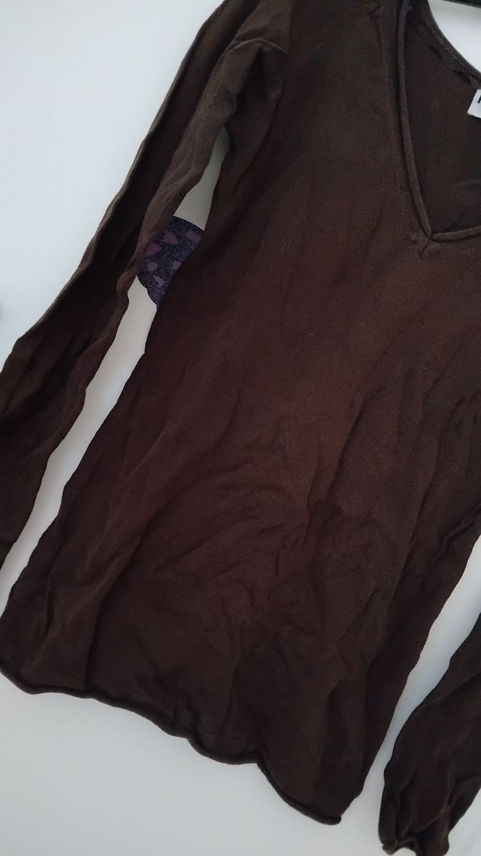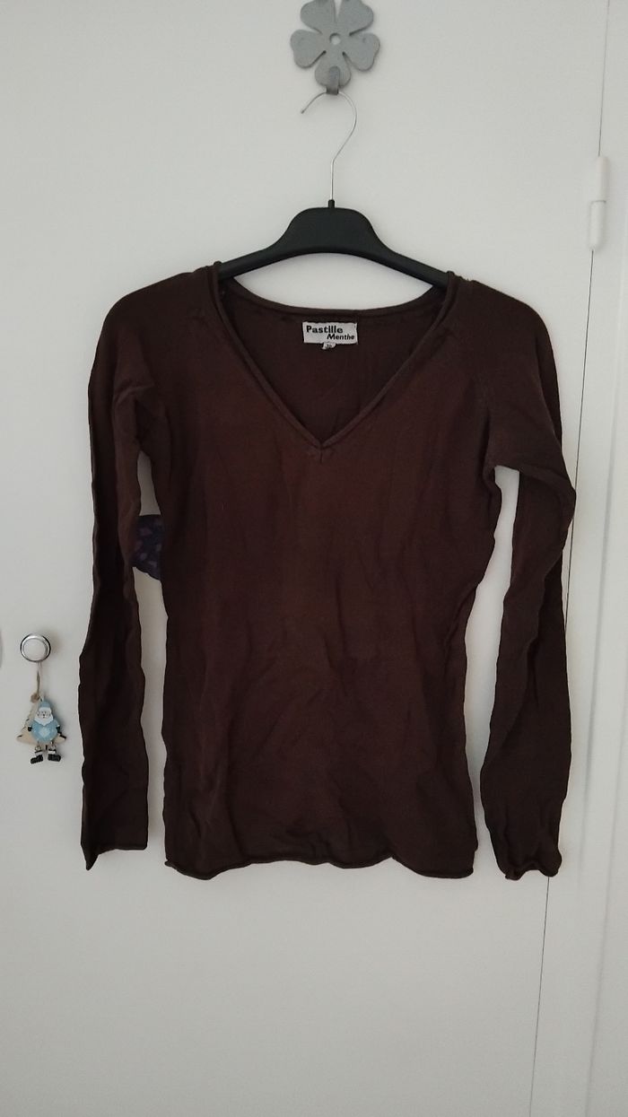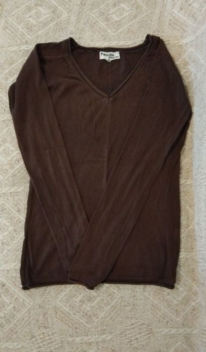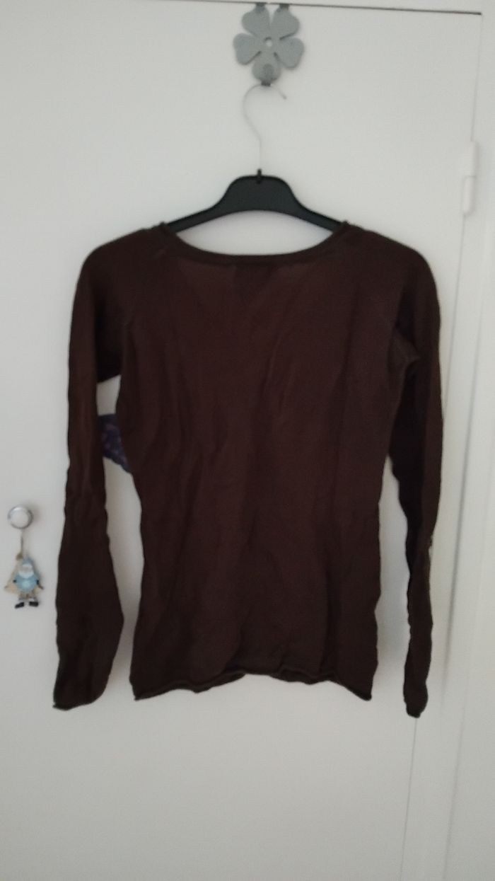 Petit pull marron fin 100% coton Beaucoup porté donc usure normal Étroit noté 38 mais correspond plus 36