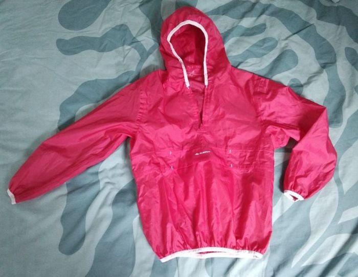 Veste imperméable à enfiler avec capuche - 8/10 ans La veste se range dans sa poche ventrale Écriture étiquette intérieur et 2 petites tâches à l'intérieur de la capuche