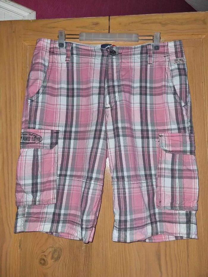 Short homme forme cargo avec 2 poches sur les côtés Taille 36 US ou 46 français Rose gris blanc Lenny & Loyd 100% Coton Longueur totale 61 cm Taille à plat 50 cm Excellent état, porté 1 fois, lavé