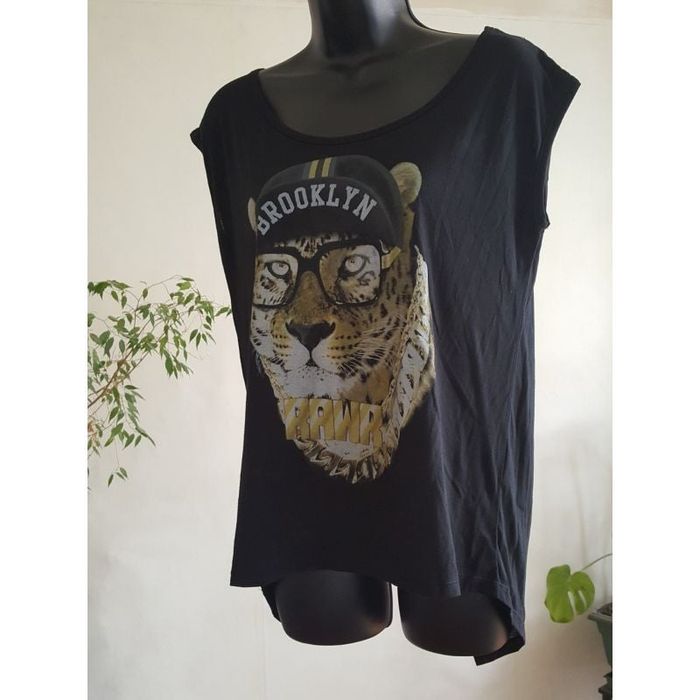 Tee Shirt Ardene Taille M Ouvert sur l arrière Noir avec motif tête de Leopard 65% Polyester 35% Rayon Etat neuf avec etiquette