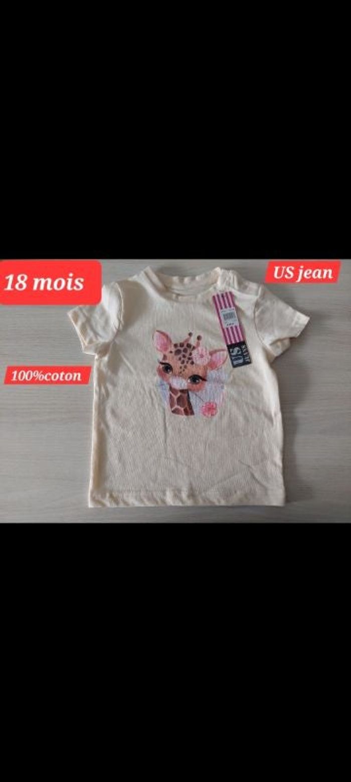 Vends Tee-shirt manches courtes motif une girafe fille 18mois Il est en très bon état et il a été mis Maison non fumeur. Le prix d'achat est indiqué sur la photo 1