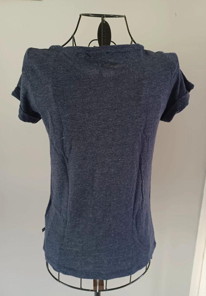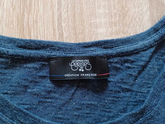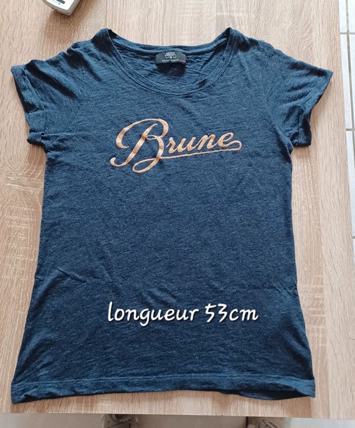 tee shirt bleu gris chiné ecriture doré coton et viscose porté une fois le temps des cerises #teeshirtpikachu10 #femme34pikachu10