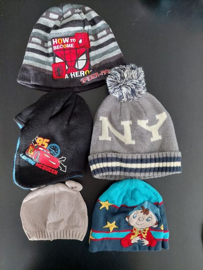 Vends Bonnet garçon Spiderman taille 54 Cars taille 52 NY taille unique Marron clair 6/12 mois Oui oui taille unique Ils sont en très bon état Maison non fumeur 1€ le bonnet
