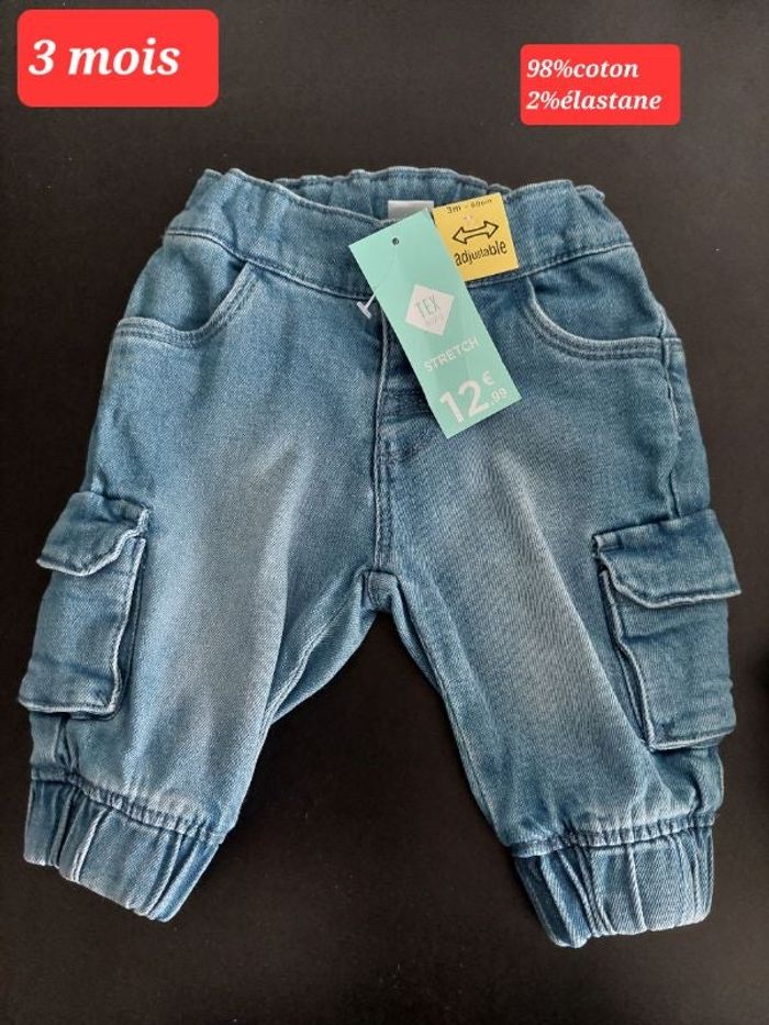 Vends Jean pour fille 3 mois. Il est réglable à la taille Il est en très bon état car très peu mis. Maison non fumeur Il y a le prix d'achat en photo 1.