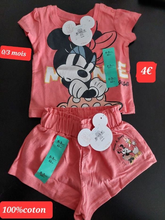 Vends Ensemble short et tee-shirt Minnie 0/3 mois. Il est en très bon état. Maison non fumeur