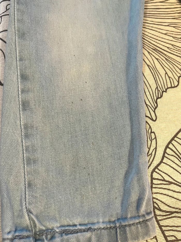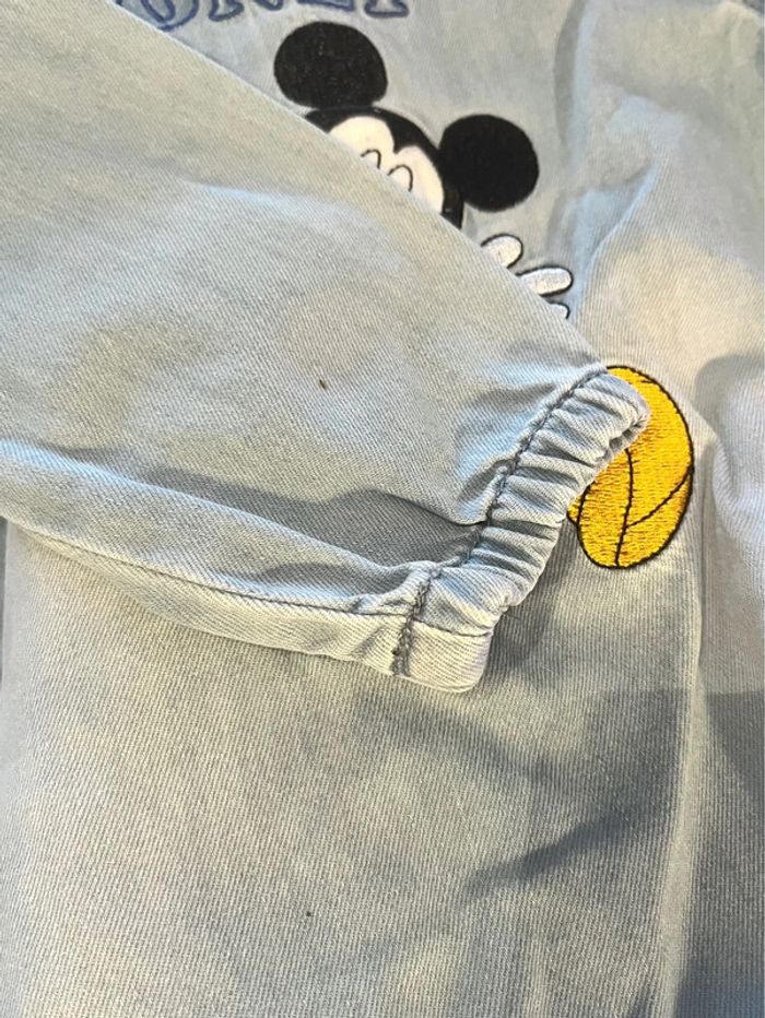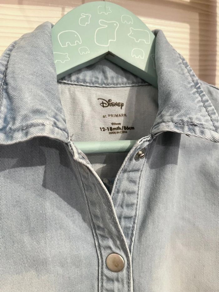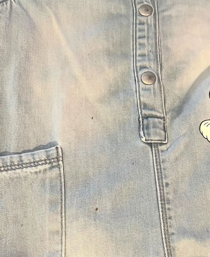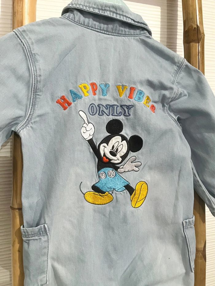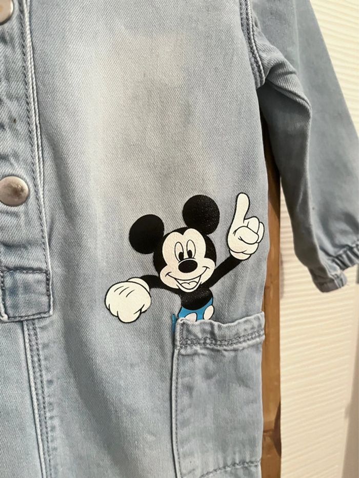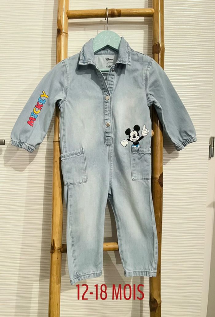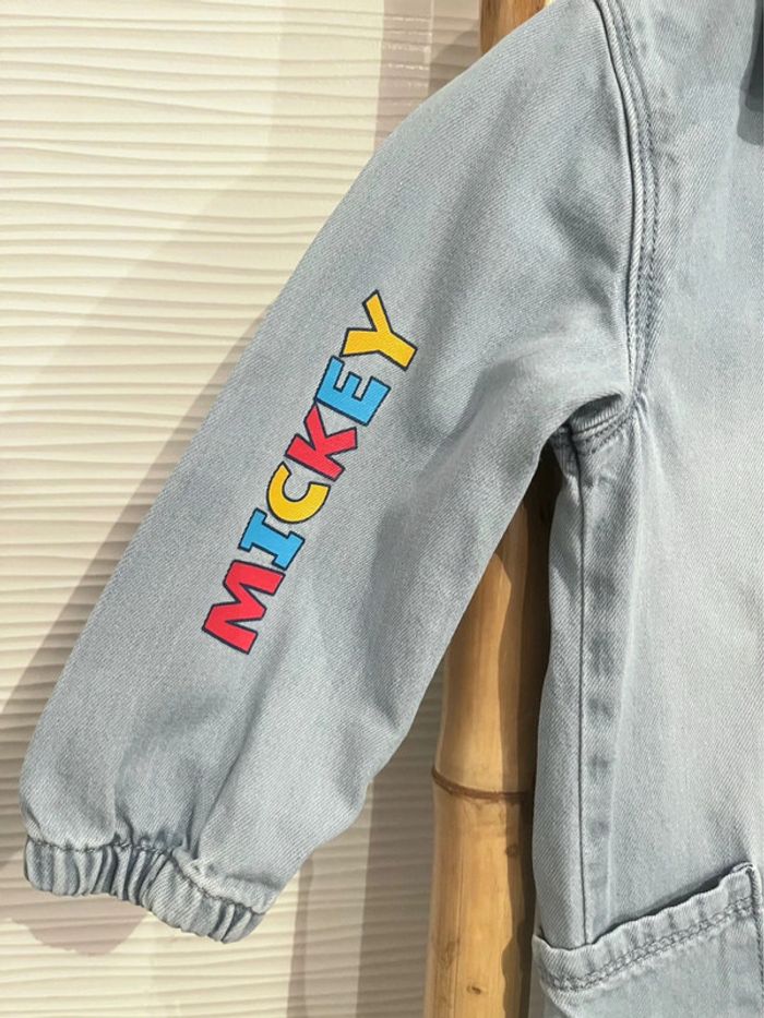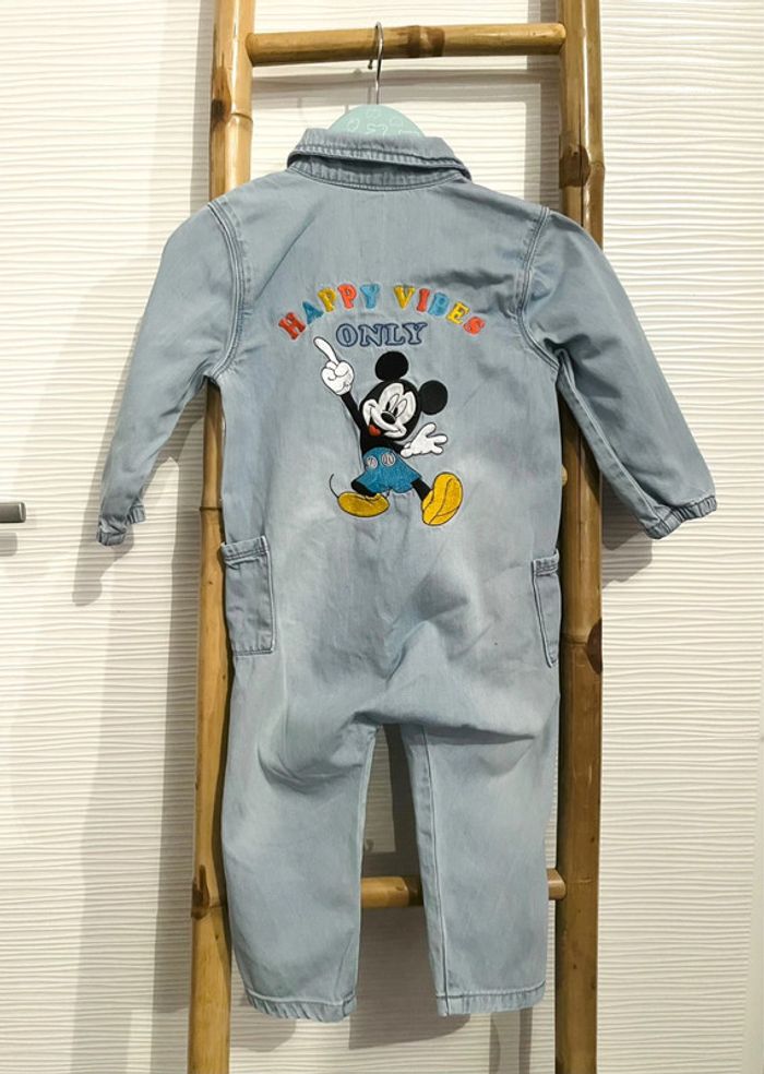 Combinaison en jean bleu clair Mickey, motif en surpiqûre au dos, 4 boutons pression devant et 2 poches de côté. Taille 12-18 mois (86cm)