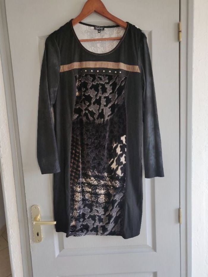 Taille 42, largeur aisselle à aisselle 53 cm, longueur 93 cm, mise 1 fois comme neuve