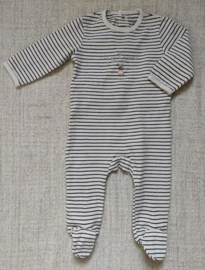 Dors bien 6 mois Kiabi. En coton léger, rayé blanc/bleu avec motif sur le devant. Ouverture par pressions dans le dos. Très peu porté.
