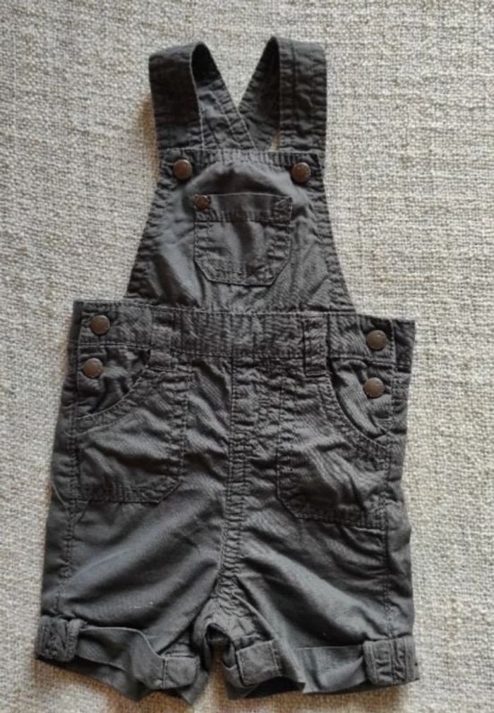 Salopette courte taille 3 mois marque Kiabi. Couleur marron. Ouverture par pressions au niveau des bretelles, sur les côtés et à l'entrejambe.