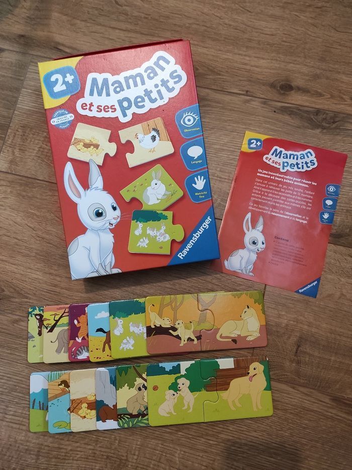 Puzzle Maman et ses petits Ravensburger. 12 paires de cartes-puzzle où l'enfant associe les petits animaux à leurs parents. À partir de 2 ans. Neuf, jamais utilisé car cadeau reçu en double. Juste une trace de coupure sur la boîte (voir photo).