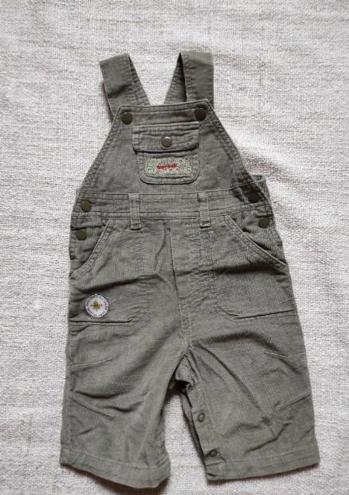 Salopette velour taille 3 mois sans marque. Couleur kaki. Ouverture par pressions au niveau des bretelles, sur les côtés et à l'entrejambe.