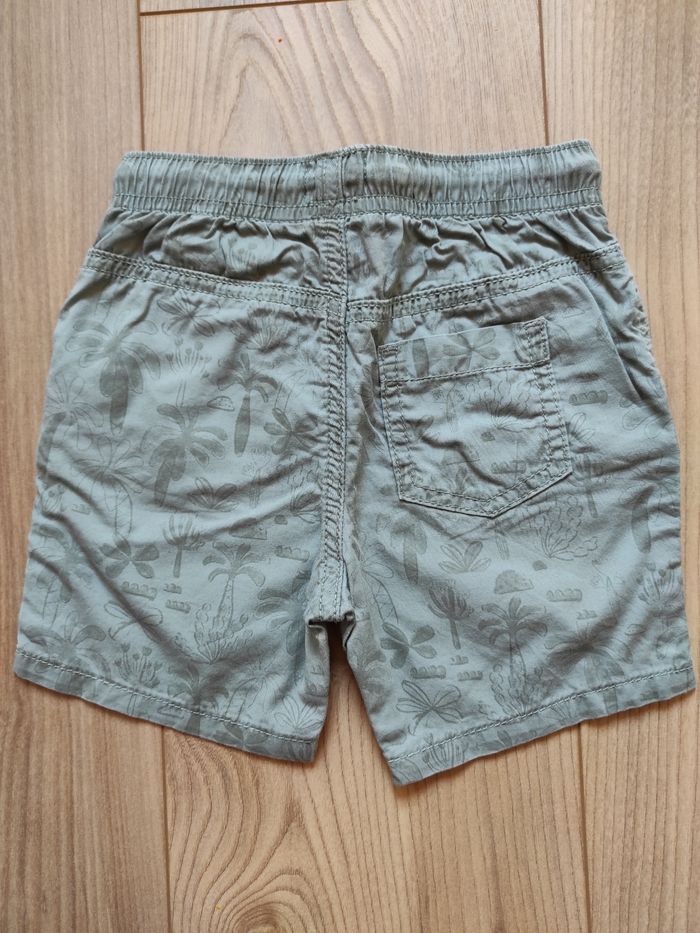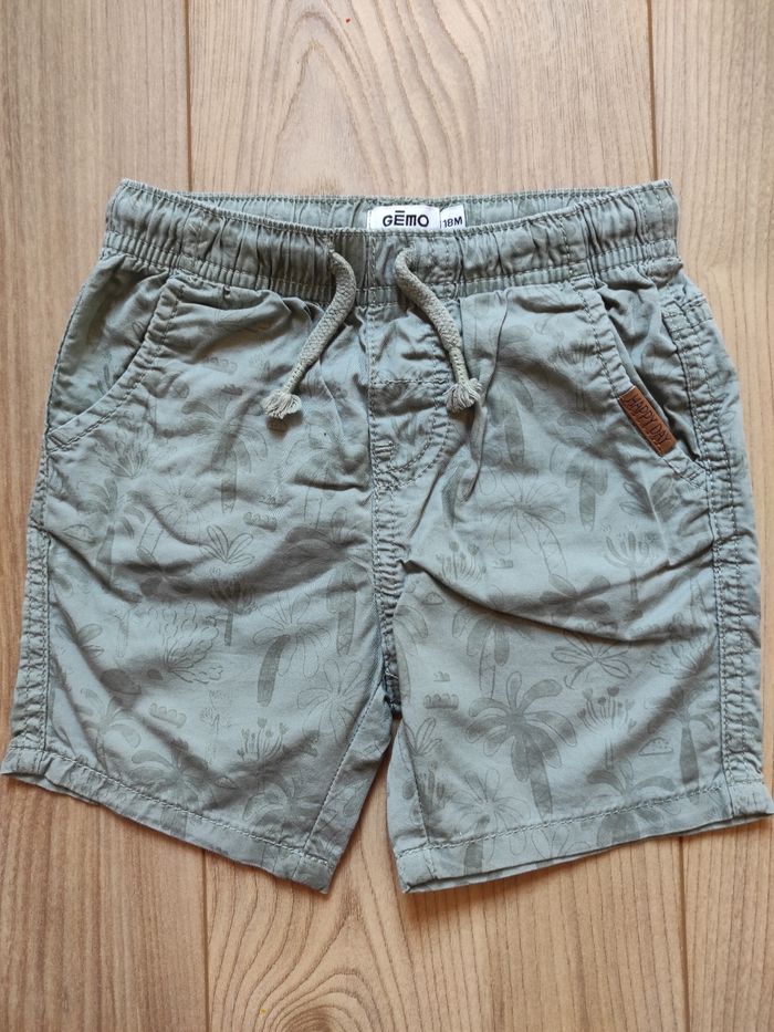 Lot 2 shorts 18 mois Gémo. Couleur kaki avec motif pour l'un, vert uni pour l'autre. Lien au niveau de la taille.