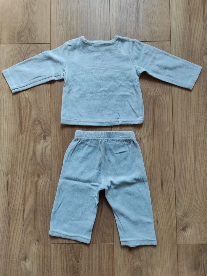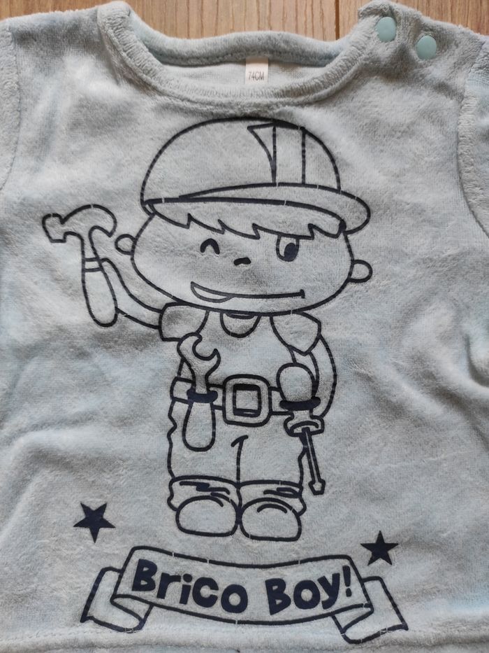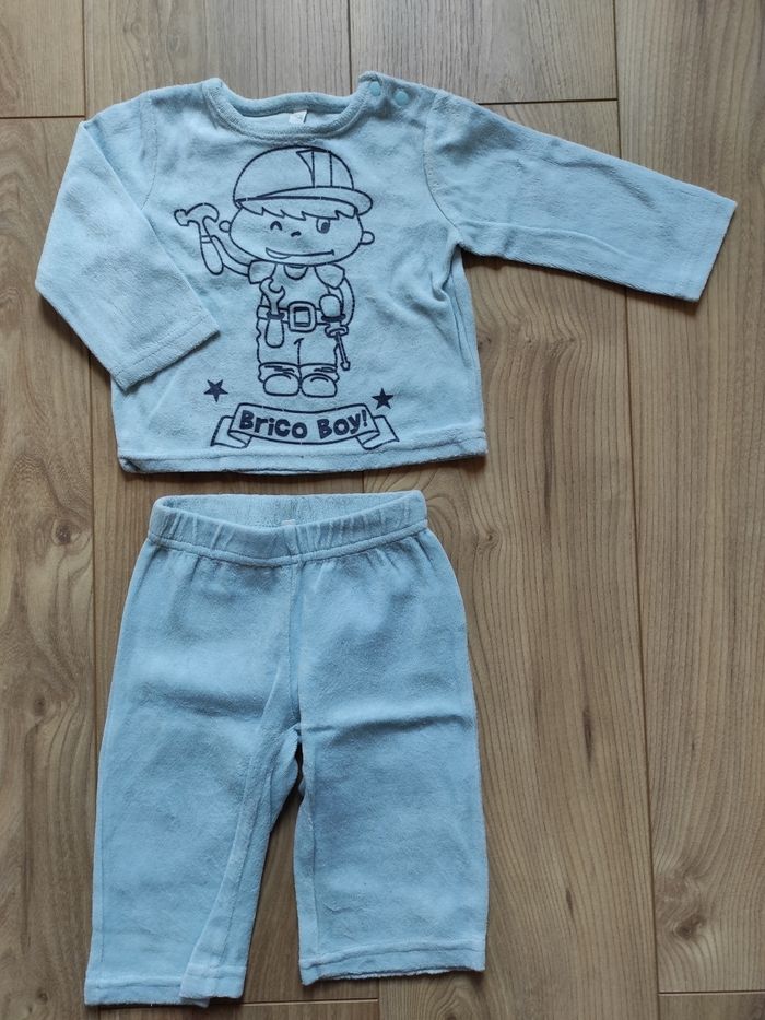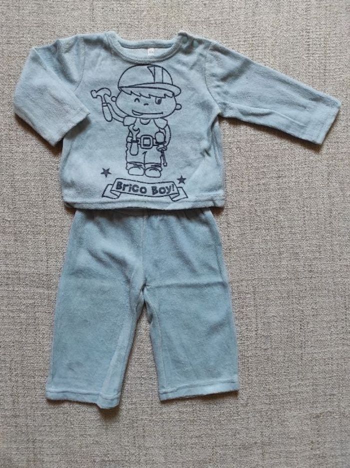 Pyjama 12 mois bleu clair avec motif bricoleur sur le devant. Ouverture du haut par pressions au niveau de l'épaule gauche.