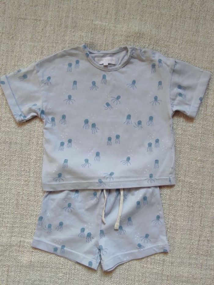 Short + t-shirt 6 mois Cadet Rousselle. Bleu avec motifs pieuvres. Ouverture du t-shirt par pressions au niveau de l'épaule gauche. Liens au niveau du short.