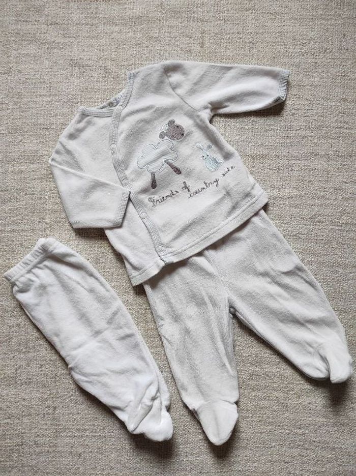 Pyjama 2 pièces taille 3 mois marque Kitchoun. Blanc avec animaux brodés. Ouverture par pressions sur le devant. Pantalon de pyjama Kitchoun avec pressions pour l'accrocher au haut de pyjama. Un 2eme pantalon blanc sans marque offert.