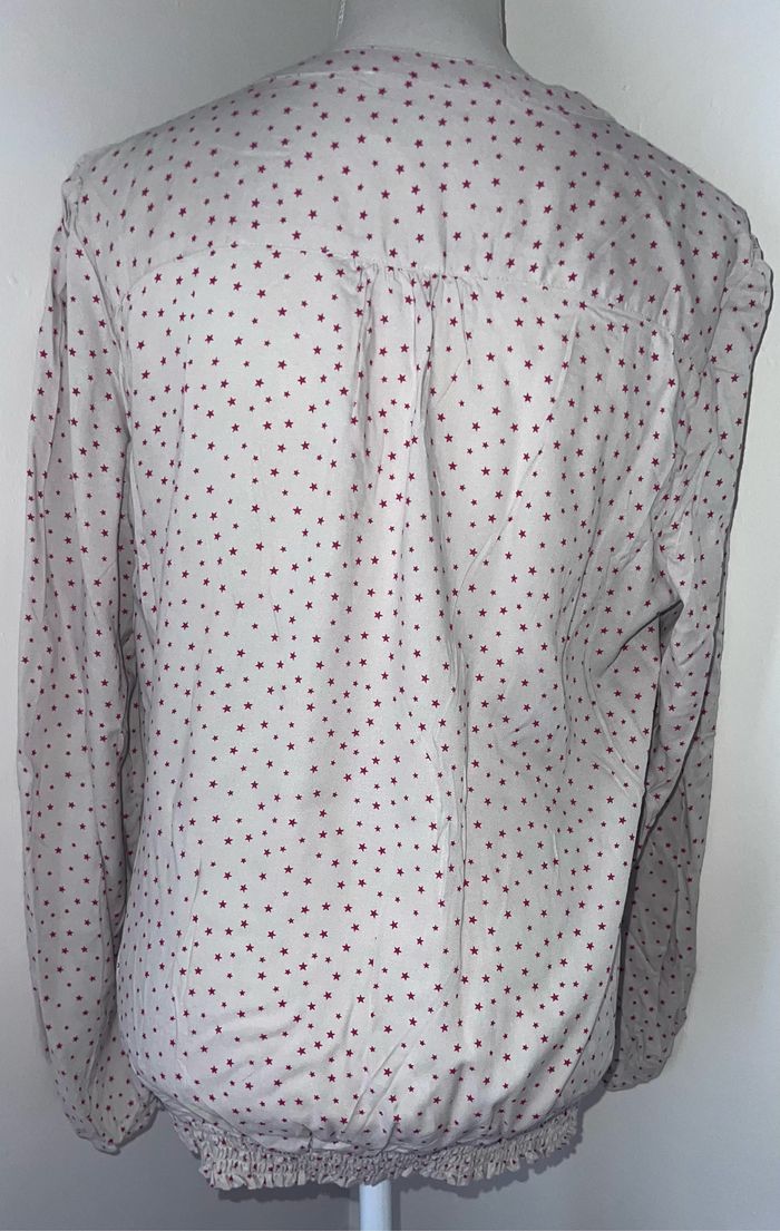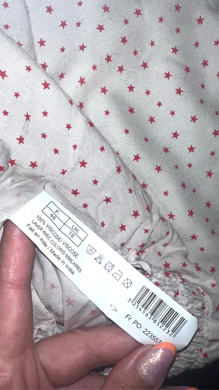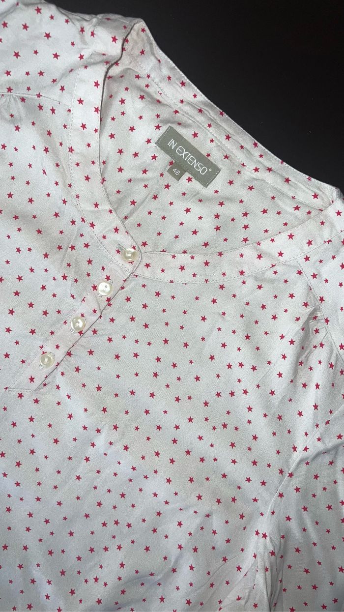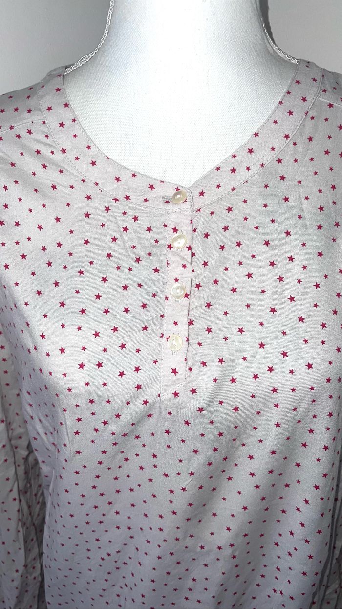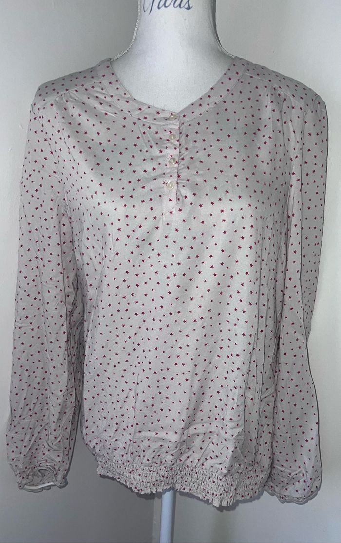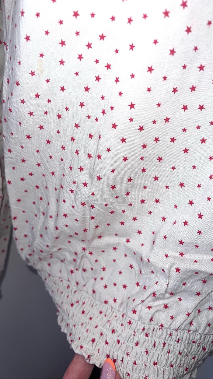 Blouse chemisier In extenso Taille 46 Manches longues légère Coloris beige avec des étoiles rouges 52 cm de largeur 67 cm de longueur Boutons sur le devant Élastiqué sur le bas et aux poignées 100 % viscose Petite tâche à un endroit (3 ème photo) Maison non fumeur et sans animaux 📩Je réponds rapidement aux messages 📦Envoi rapide et soigné