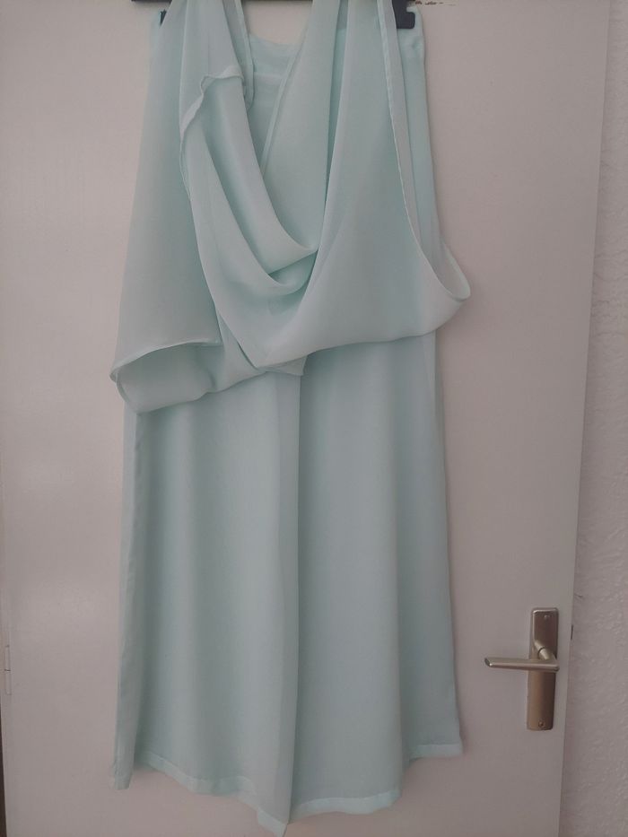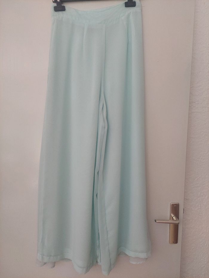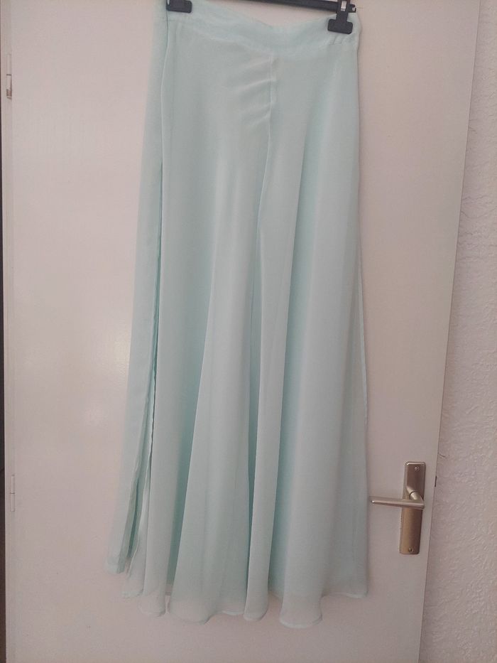 En bon état. Marque Bleu Bonheur. Tunique : couleur vert clair avec motifs. Taille 40. 100 % Polyester avec doublure 100 % Polyester. Avec fermeture éclair dans le dos. Dimensions : Largeur épaules 38,5 cm - Largeur poitrine 48,5 cm - Longueur 81 cm - Largeur bas 52 cm Pantalon couleur vert clair avec fermeture éclair sur côté gauche avec voile à l'arrière. Taille 38. 100 % Polyester. Dimensions : Largeur taille 36 cm - Largeur cuisse 35 cm - Longueur entrejambe 70 cm - Longueur jambe 96 cm - Largeur bas pantalon 34 cm - Longueur voile sur l'arrière 101 cm