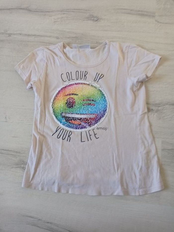 Tee-shirt marque emoji taille 10 11 ans en très bon état. La couleur blanche sur les strass sont d'origine voir photo 3