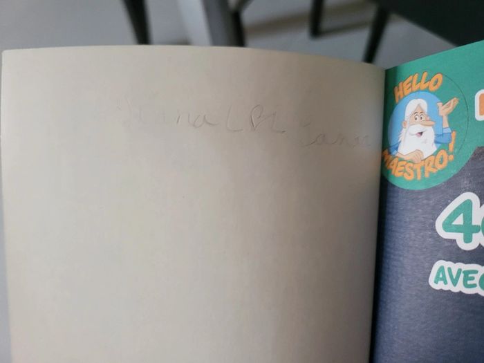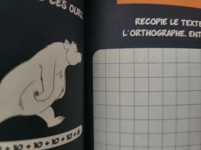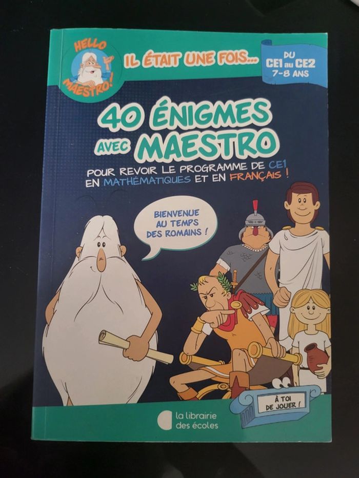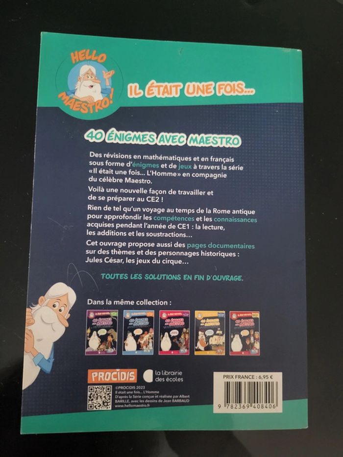Cahier de vacances du CE1 au CE2 Hello maestro "Il était une fois... L' Homme" 40 énigmes avec maestro Maths, français sous forme d'énigmes et de jeux pour réviser en s'amusant et se préparer au CE2 Pratiquement neuf. En effet, ma fille a seulement mis son nom au crayon à papier à l'intérieur de la couverture (gommé mais il reste des traces) et a fait au crayon à papier l'exercice des ours (gommé aussi) et écrit un mot sur la page d'à côté (gommé également) (cf photos) Le reste est vierge.