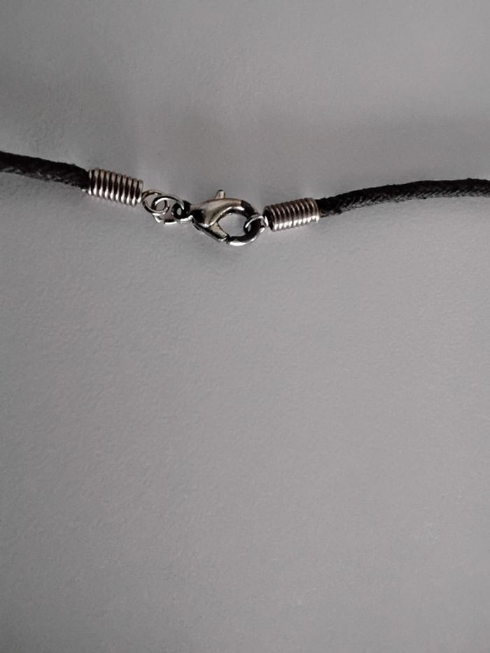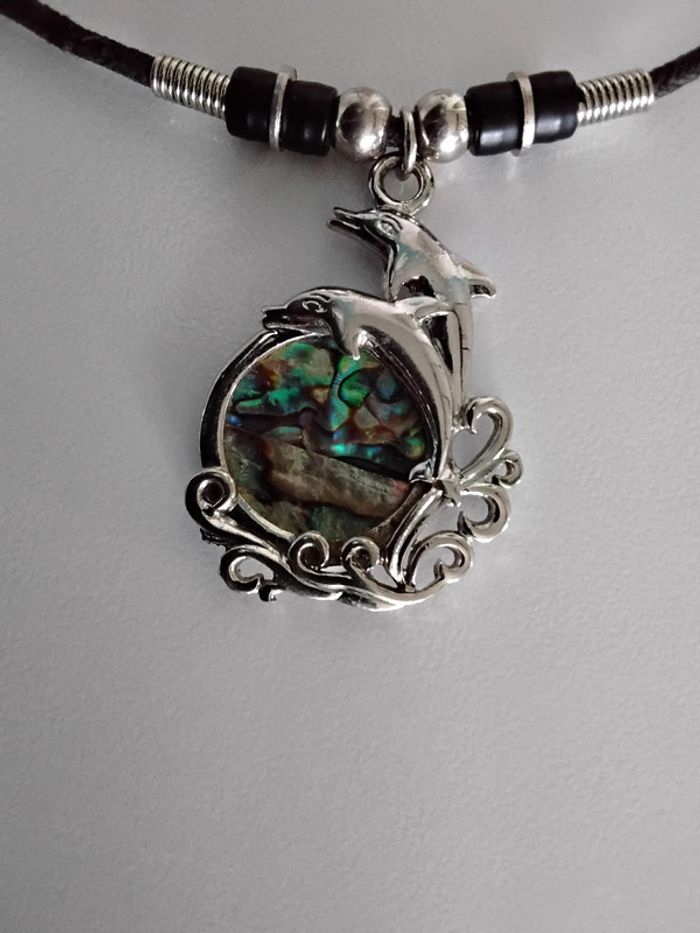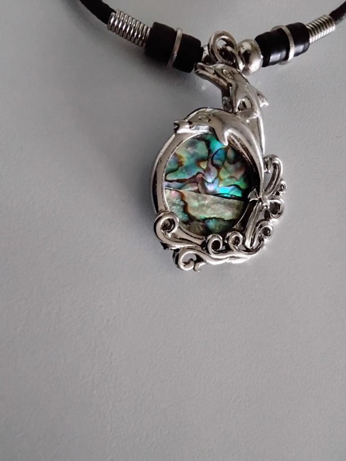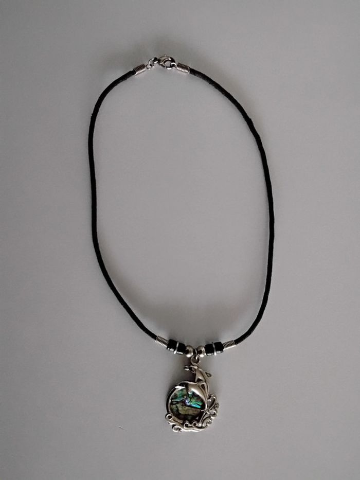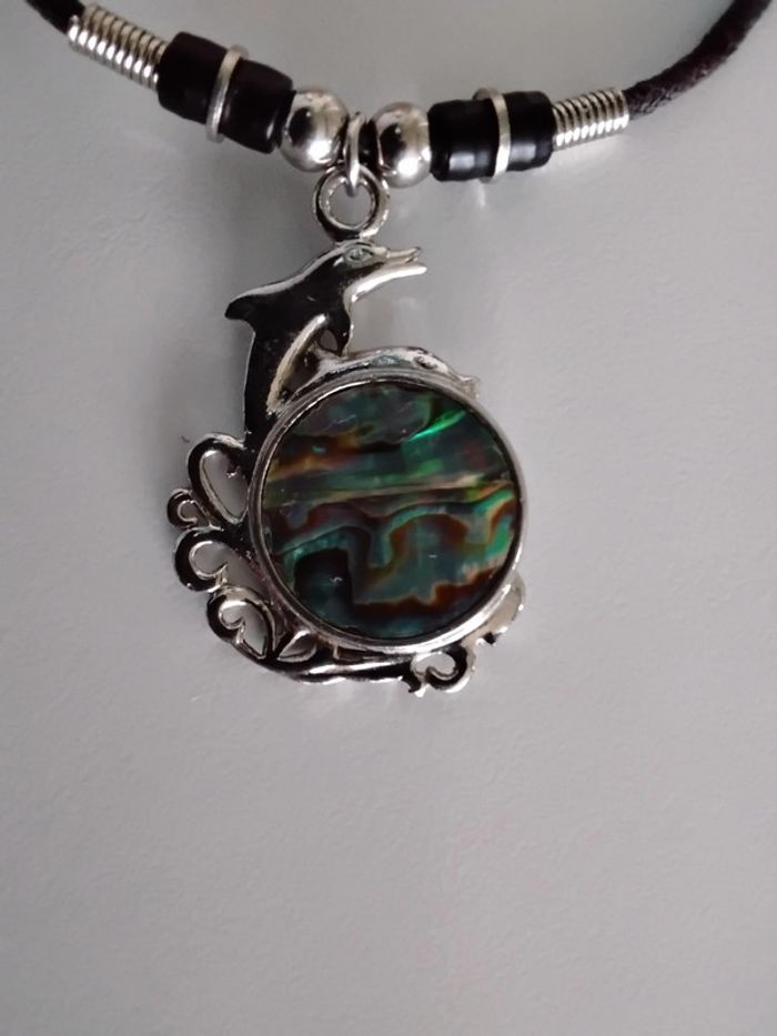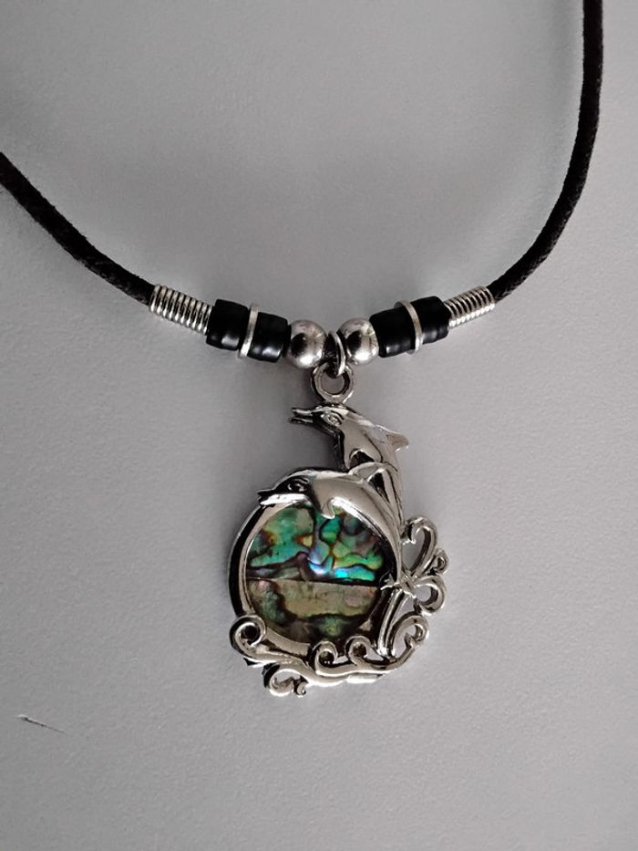 Collier des années 90 avec cordon noir et pendentif dauphins et rond de nacre bleue verte. Le cordon et l’attache présentent de légères traces d'usure, le pendentif est en très bon état. #julievertrezbijou